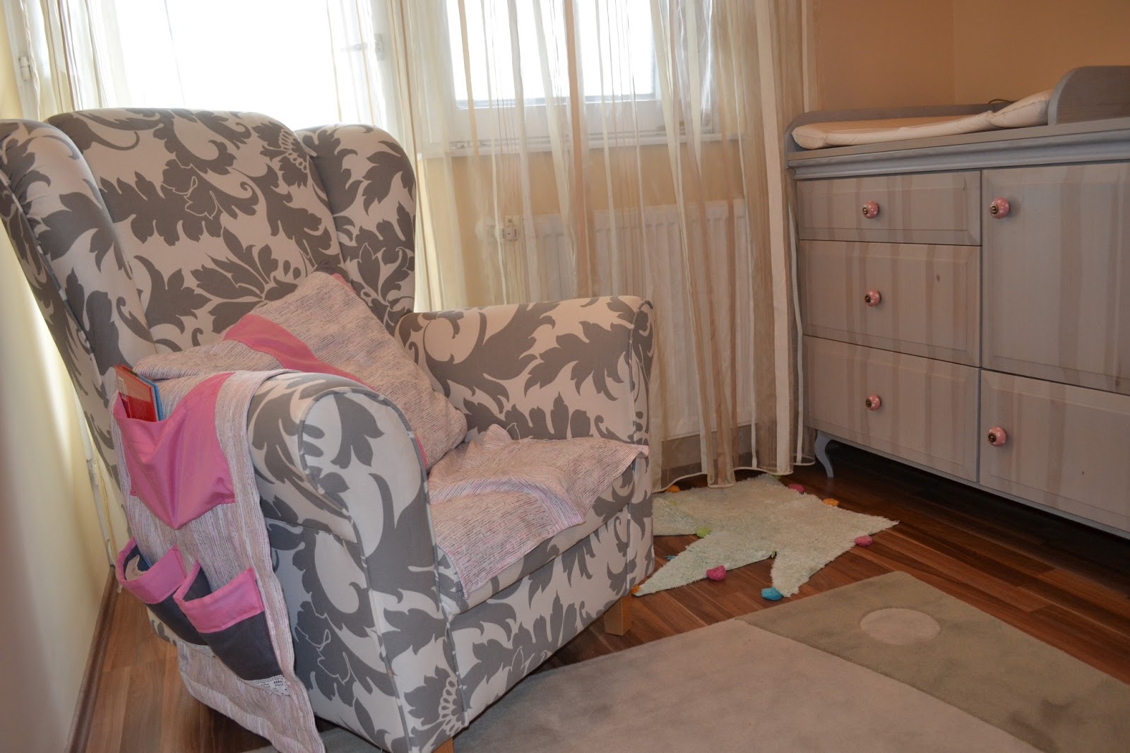 A fotel egy szoptatni vágyó anyukának elengedhetetlen, ami a későbbiekben (most), meseolvasó, mesélő kuckóvá alakul át. A tisztán tartása végett a kiegészítők anyagából készült egy, az ülőfelületet takaró anyag. Oldalt lefut egy zsebes tároló, ami nagyon hasznos volt és hasznos a mai napig. Szerettem volna ha a kezdeti időszakban a saját kényelmemet szolgálja (papírzsebkendő, anyagpelenka, krém, egyéb kellékek tárolása, olvasnivaló elhelyezése, ha épp majd az ölemben alszik), így is lett. Azután pedig a kislányom számára kedves dolgokat rejtse majd. Így is lett: a legkedvesebb könyv, ujjbábok, állatkák helye, amit már kúszómászó korában is elért, segítség nélkül.