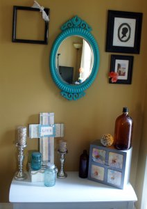 A ház otthon és gyűjtemény egyben. Régiségek, kézműves kiegészítők, egyedi bútordarabok mindenütt. És ami fantasztikus (a szkeptikusok figyelmébe is ajánlom), hogy az egyes berendezési tárgyak milyen tökéletességgel vannak összhangba hozva. A lámpához lett a falszín kiválasztva, a varrott szőnyeg témája a tanyasi életet festi le, amihez illeszkedik az olajfestmény, az öntött vas kakas figura. Az ülőbútorok pedig egy kis klasszikus-romantikus vonalat hoznak, ami a másik helyiségben folytatódik.