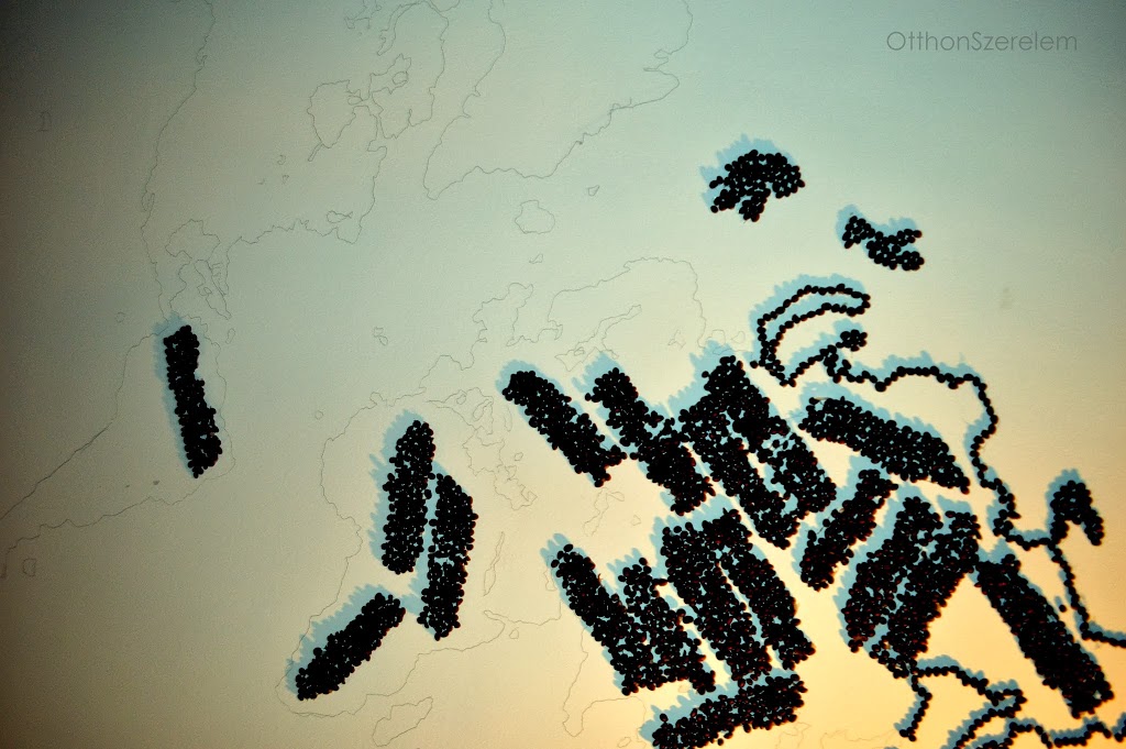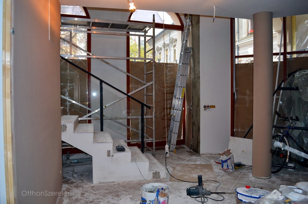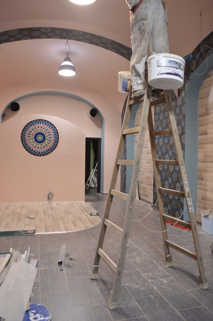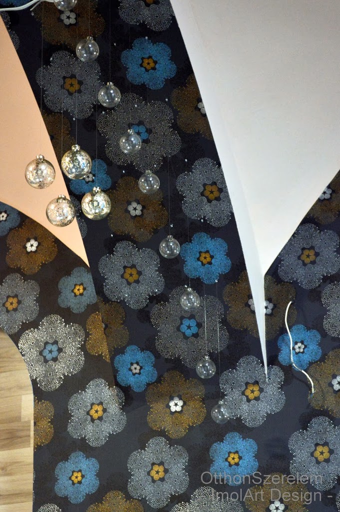 És amitől sokat várok..azok az üveggömbök! 350 db üveggömb kerül felfüggesztésre, mégpedig a két középső, tapétával fedett ívről. Szintén karácsonyi üveggömb, áttetsző, kivettük a karácsonyi dísz jellegét adó fémvéget, és damillal került fel.