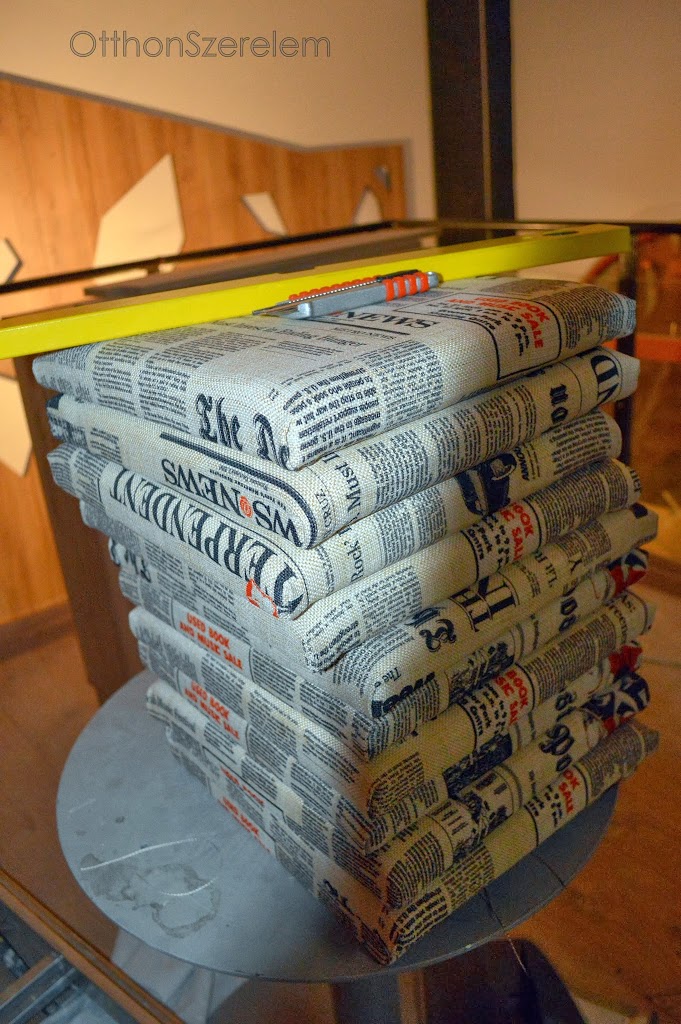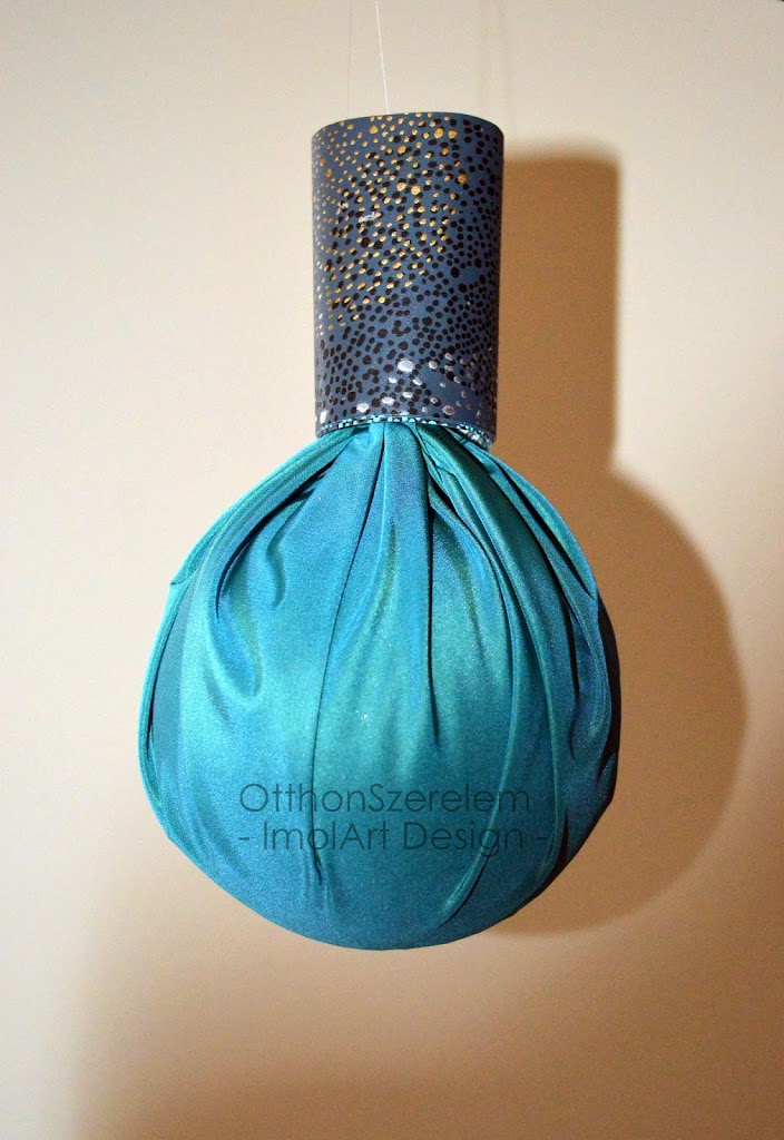 Itt van az újabb gömböcske. Ez egy karácsonyfadíszgömb, 12cm átmérőjű, textillel bevonva, a függesztésének takarására pedig tapétát használtunk. Szerintetek hova kerül?