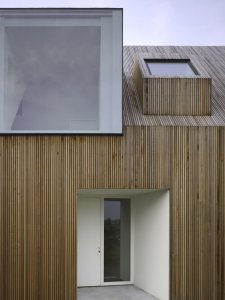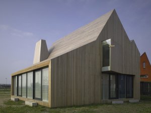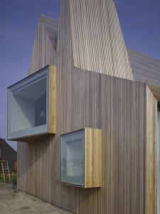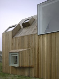 Milyen egyszerű és mégis nagyszerű! Különlegességét az egész külsőt beborító faburkolat adja, illetve a kiemelkedő, különböző formájú ablakok. Nem egy édes otthon jut eszembe így először róla, de valószínű a tervezőnek (Rocha Tombal) sem az volt a célja.