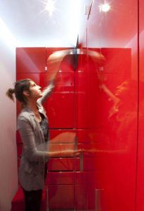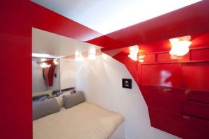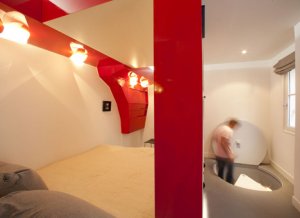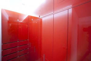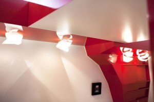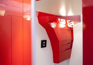 A magasfényű ferraripiros bútorfelületek, a formai egyediségek és a világítás csak fokozzák az különleges megoldás hatásfokát.