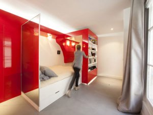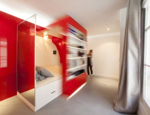 Az egész koncepció egy mobil könyvespolc köré épült föl. Ennek mozgatásával kerül hozzáférhetővé a munkaasztal, vagy épp rejtőzködik a hálófülke.