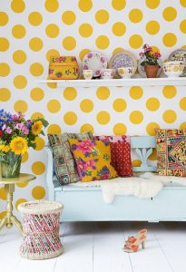 A nagy pöttyös az örök vidámaknak, és azoknak való, akik nem unják meg egy év alatt. Szerintem a nagy, impozánsabb mintákkal csínján kell bánni, tényleg könnyen a terhünkre lehet, olyan felületeken érdemes behozni, amiket időközönként cserélhetünk (kanapéhuzat, párnák, székek huzata..). Bár nyilván szívderítő is egyben, és aki nem ódzkodik attól, hogy 1-2 éven belül pl újra tapétát cserél, annak hajrá, hajrá.