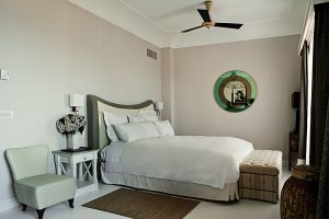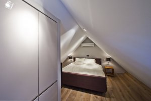 Az ágy végében lévő tükörfal kétoldalú, így mindkét irányban duplázza a tér nagyságát.