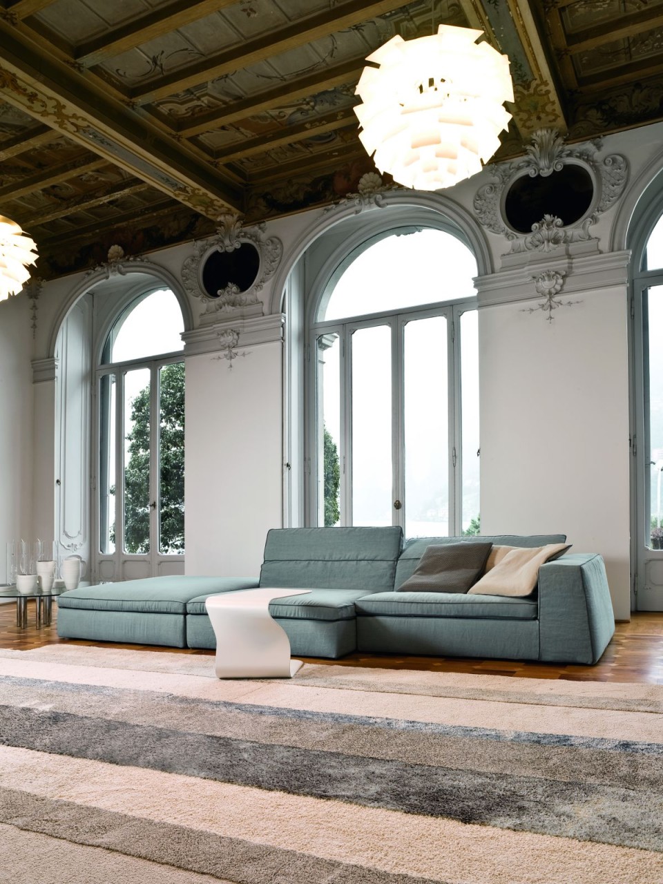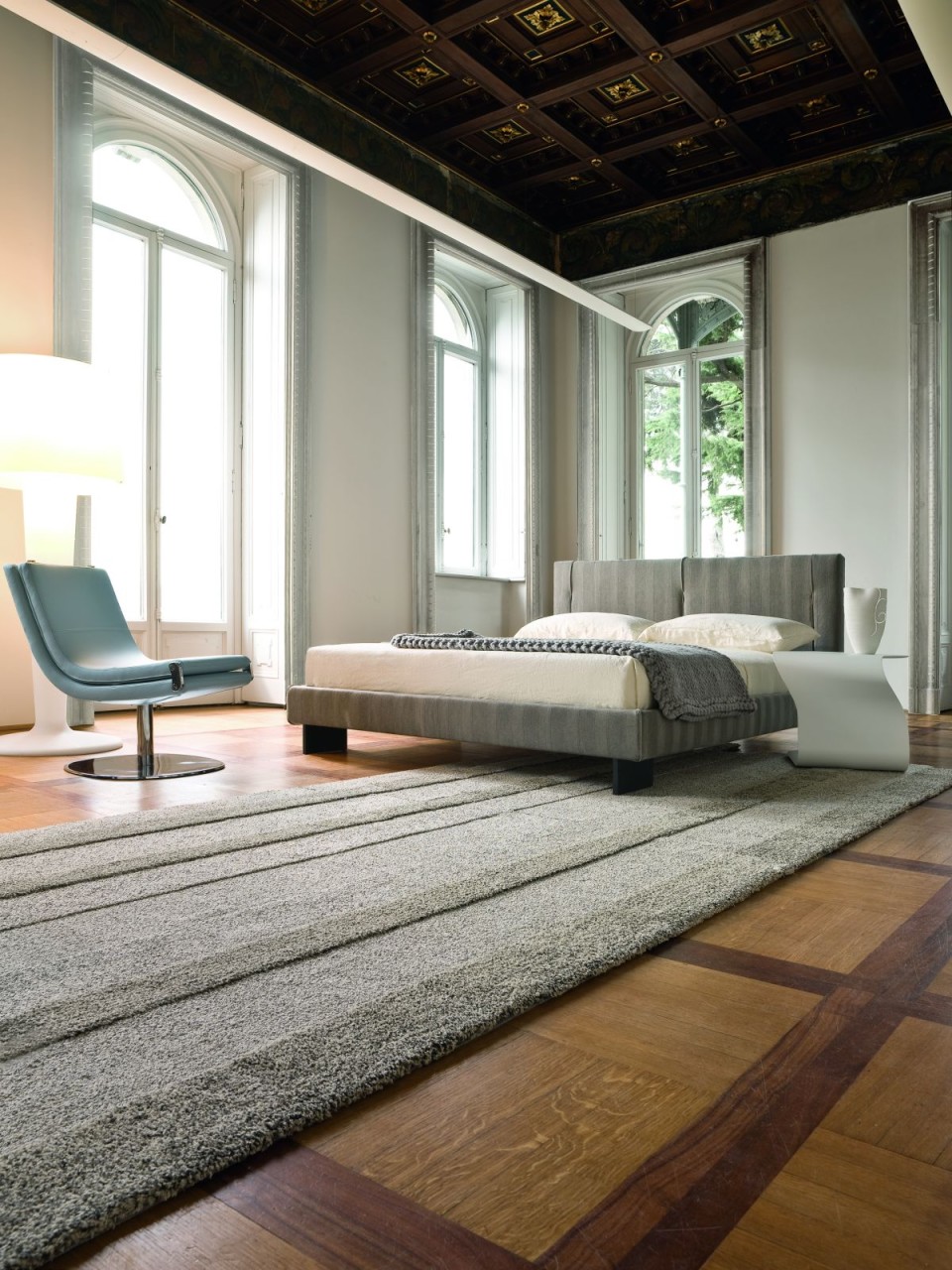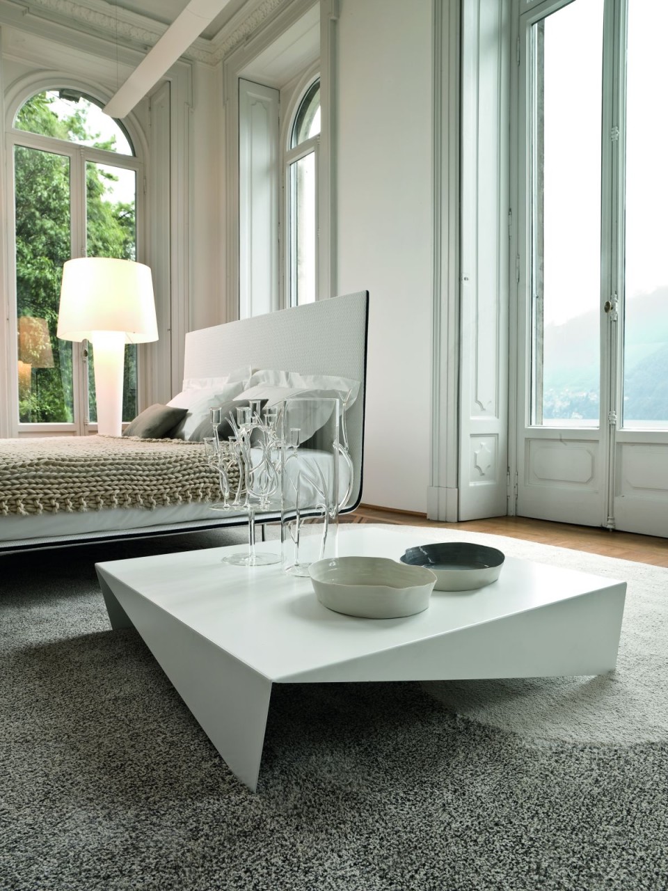 A lágy megjelenésű, habos függöny teszi könnyedebbé a szögletes formájú tárgyakkal teli szobát.