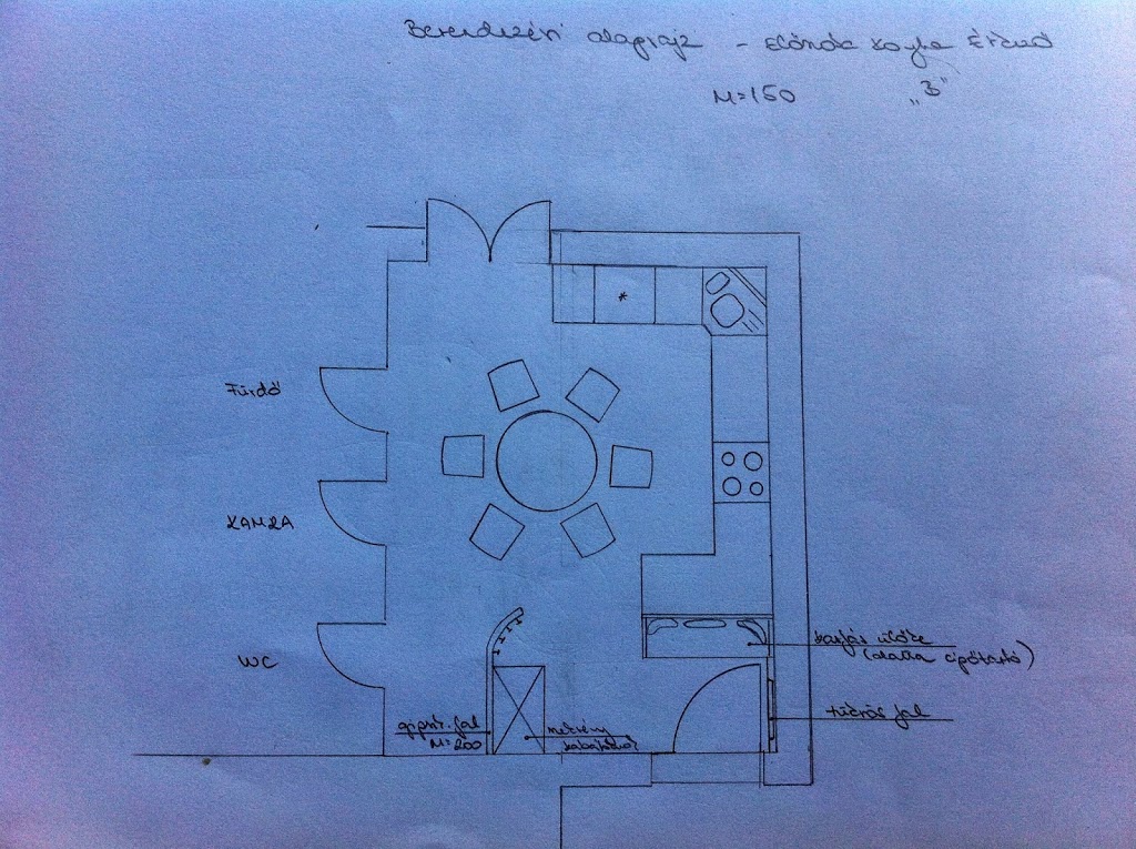 A sok skiccelés, elvetés, elölről kezdés végső eredménye egy félköríves pult, amivel nyertünk munkafelületet és meghagytuk a helyet a mosógépnek, amit így nem kellett a fürdőbe száműznünk, megspóroltuk a vízszerelés és átépítés költségeit.