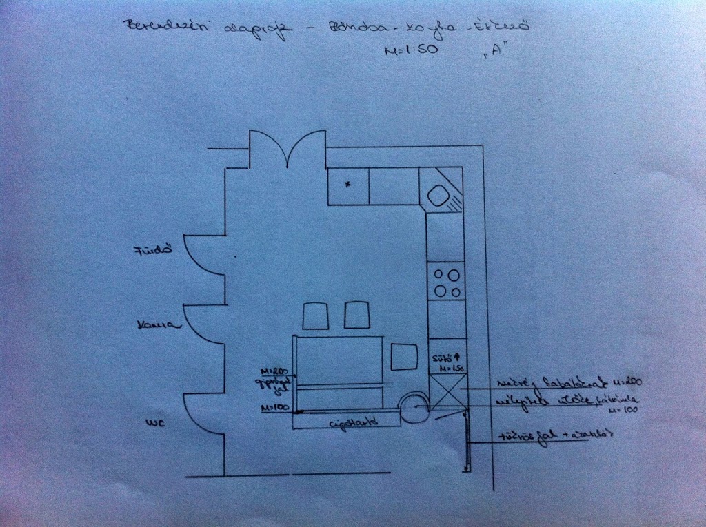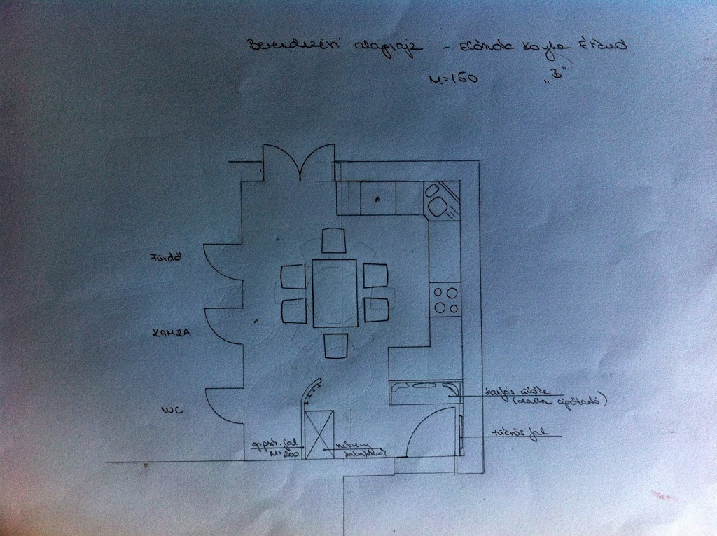 Így nem csoda, hogy ide jutottam 🙂 Amint az 1.részben is olvashattátok, a helyiség méretbeli adottságai nem túl szerencsések, így el kellett vetnünk az eredeti elgondolást, amikoris egyoldalas konyha mennyezetig fut, és a szabadon álló pult biztosítja a vizes blokkot és a munkapultot is.